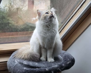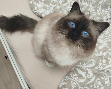 Neko n'est pas une Sacré de Birmanie. Mais elle fait partie de notre chatterie. Née en 2017, cette doyenne est nôtre mascotte à tous.